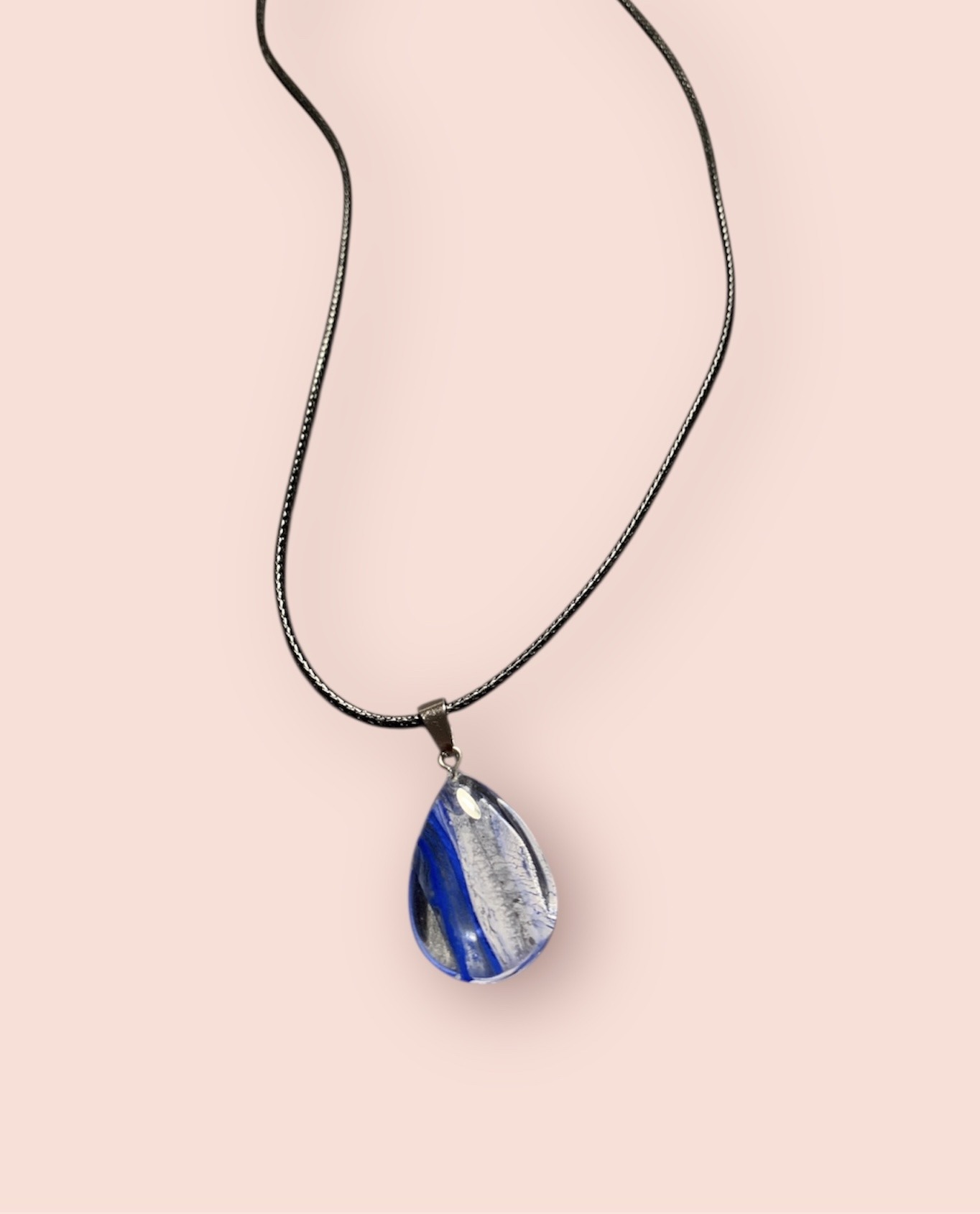 A unique teardrop, glass pendant with blue and white stripes is hung of a black waxed cord necklace. The pendant is held by a metal icepick clasp.