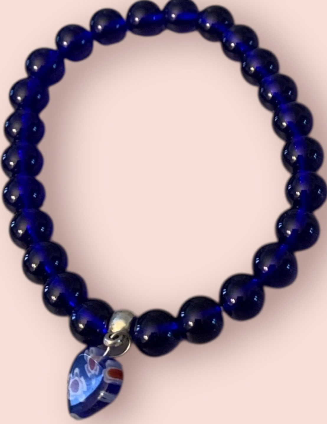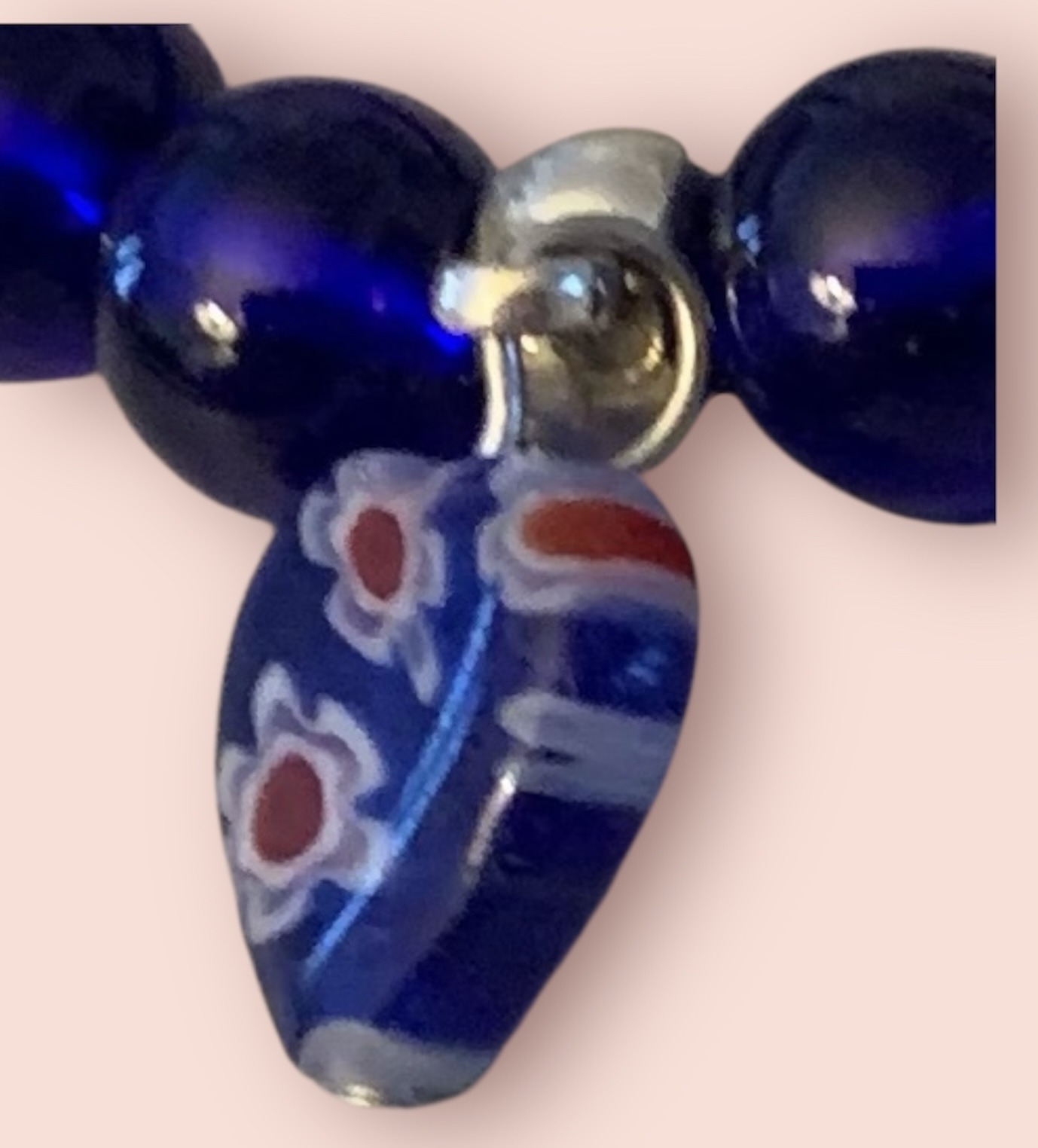 Blue glass beads giving this bracelet an elegant look. A handmade glass Millefiori glass charm with flowers gives this bracelet a sophisticated look. Suitable for a special occasion of everyday wear.