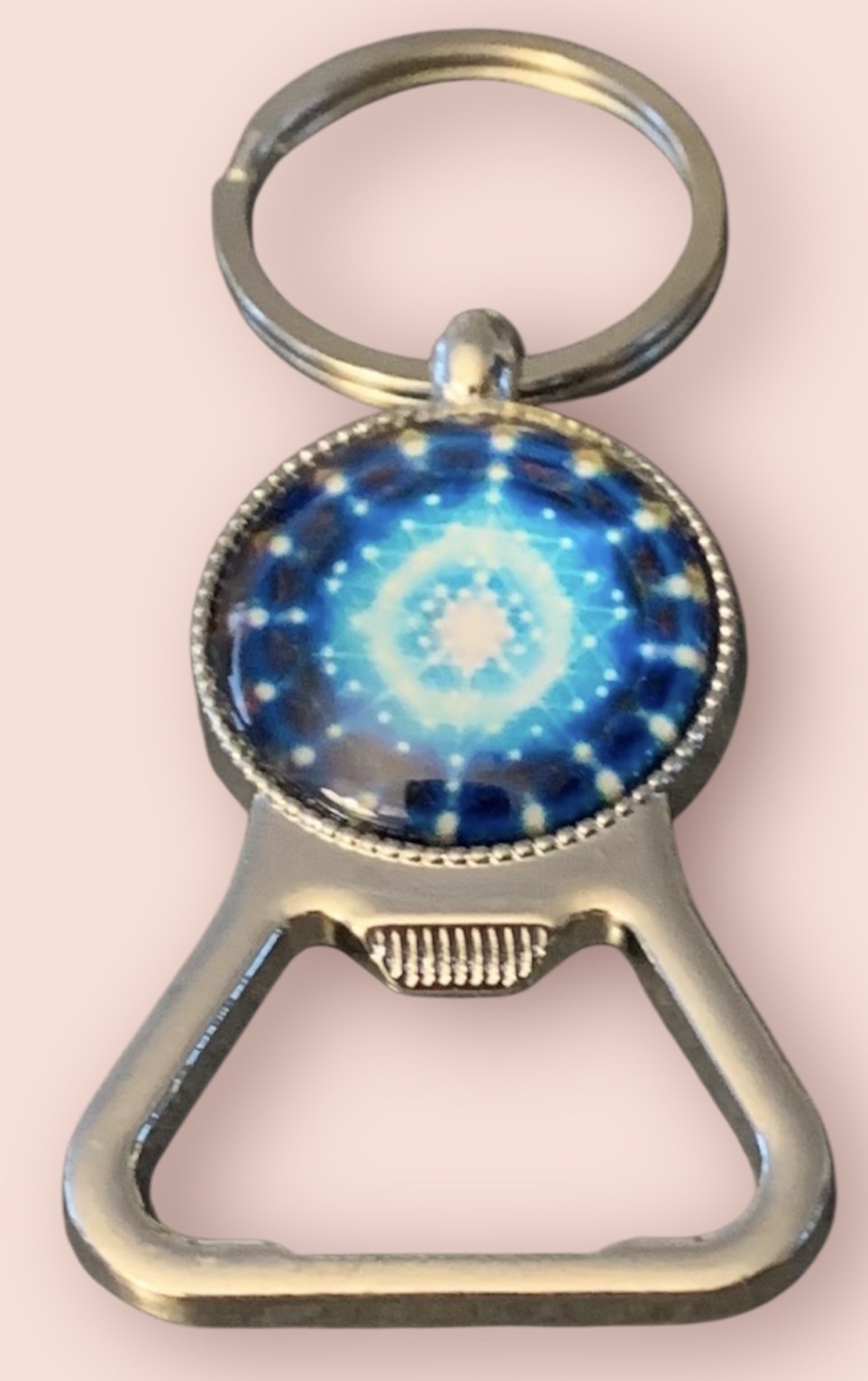 A eye catching keychain with a glass inlay decoration. The inlay has a star burst pattern that expands out from the centre, this keychain is also very practical as it has a bottle opener.