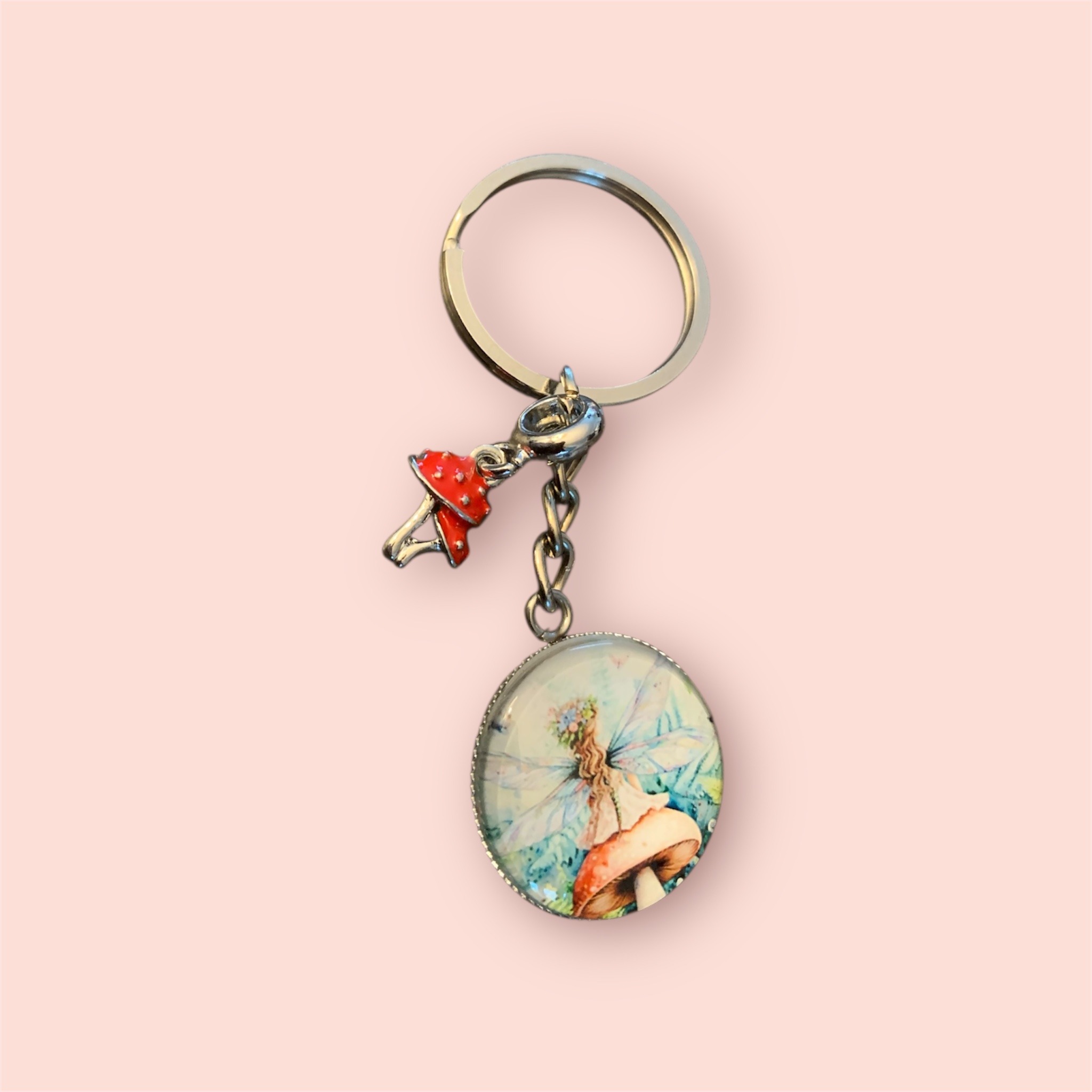 A beautiful half glass inlay featuring a picture of a fairy sitting on a mushroom. A metal charm with two mushrooms add to this keychain. The charm is oil dipped instead of enamel, so it is less likely for the colour to crack.