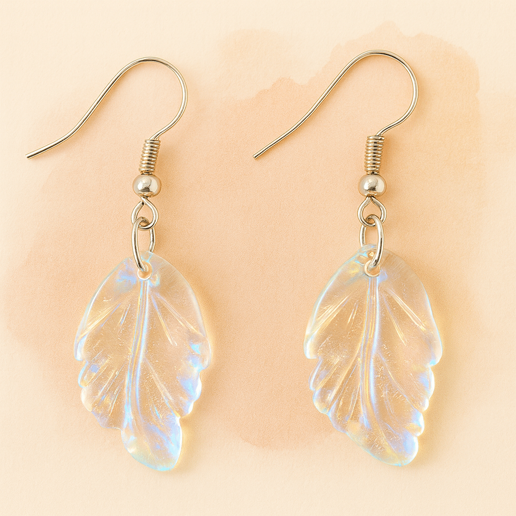 Each earring features a translucent leaf charm with a gentle iridescent glow, hanging from simple silver-tone hooks for a clean, elegant finish.