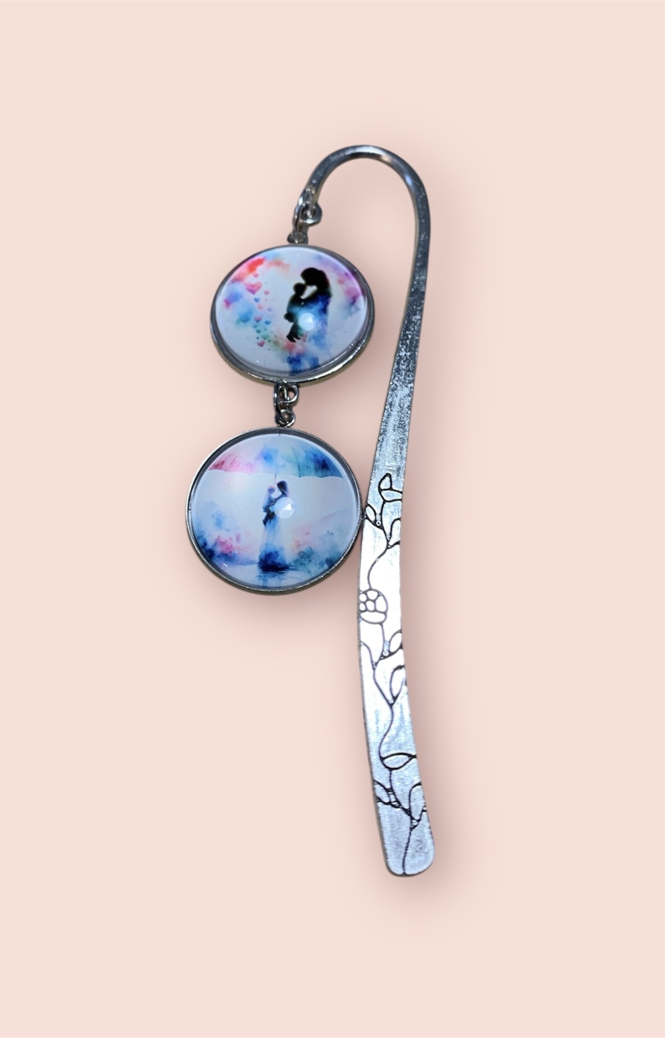 With two beautiful half glass domed inlays which magnify the pictures of the silhouettes of a mother and child. Pastel coloured hearts and umbrella adding a subtle splash of colour.