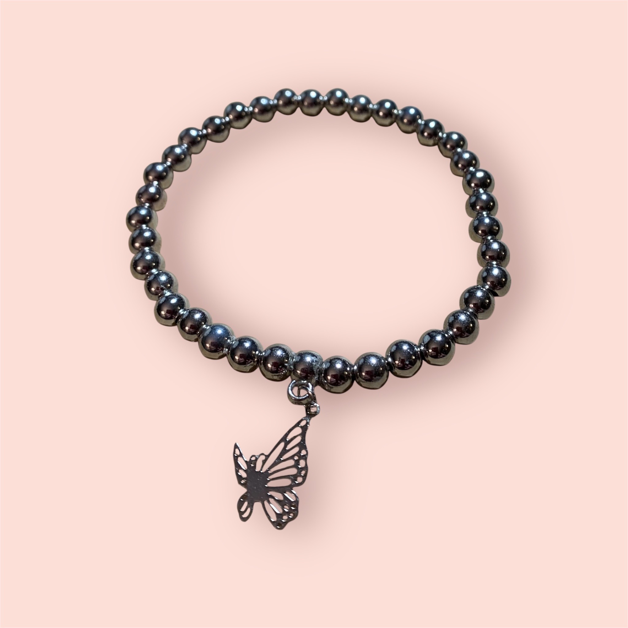 A beautiful outline butterfly charm with paired with silver coloured beads.
