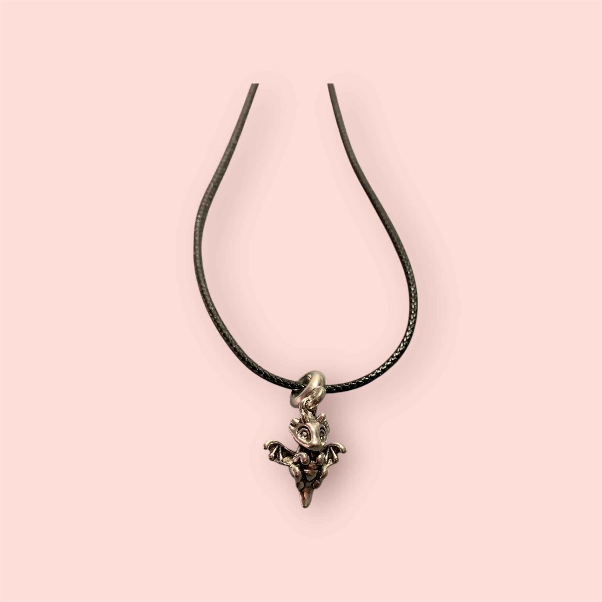 Featuring a small metal dragon whelp (baby dragon) charm, this necklace has a subtle touch to it. With a waxed cord necklace and adjustable clasp.