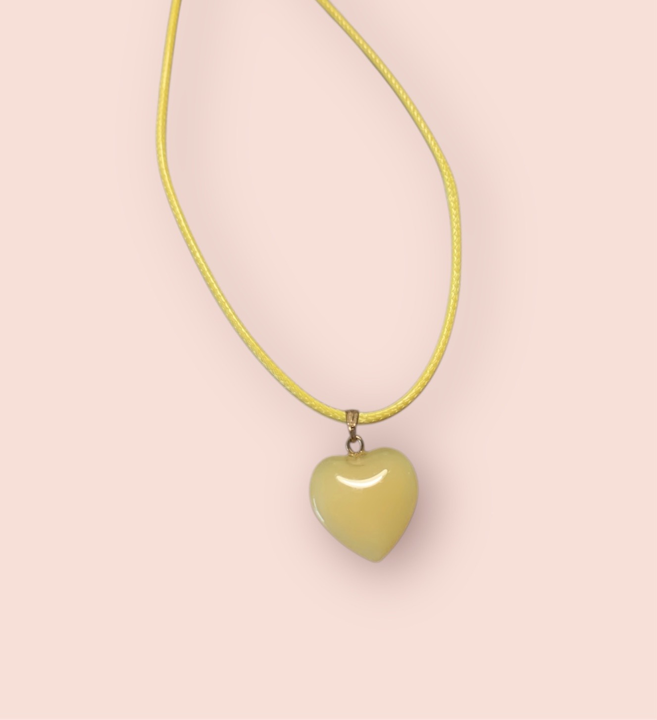 A solid yellow glass heart is the focus of this necklace. The heart pendant is on a yellow waxed cord necklace, giving the necklace a smooth feel. The necklace also has a adjustable clasp